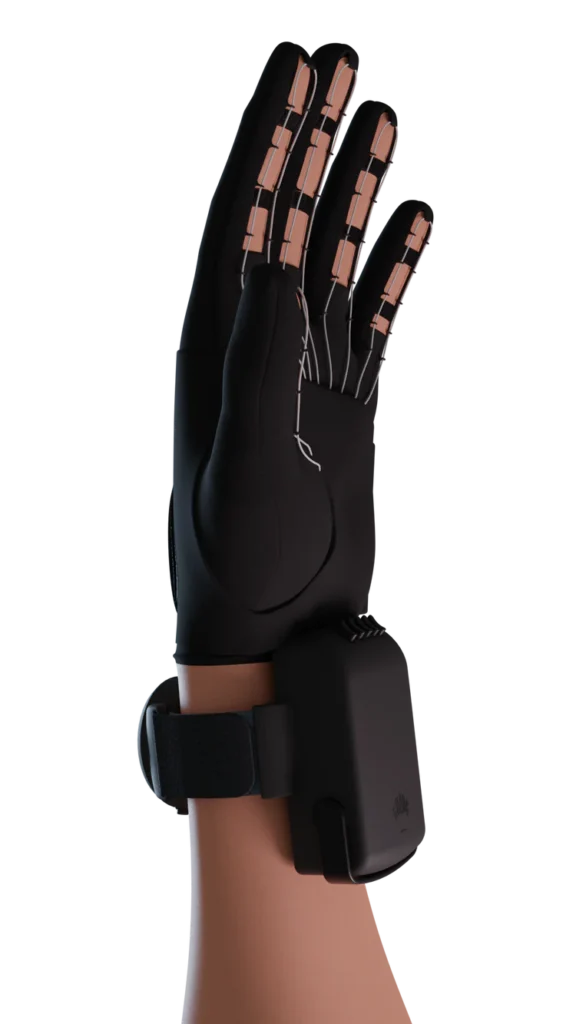 The Nuada Glove utilizes artificial tendons and a proprietary biomechanical support system to assist finger flexion in real time. When the patient positions their fingers around an object and activates the system, the glove engages to maintain a stable grasp through mechanical tendon support, enabling patients to actively participate in activities of daily living such as eating, dressing, and personal care tasks.